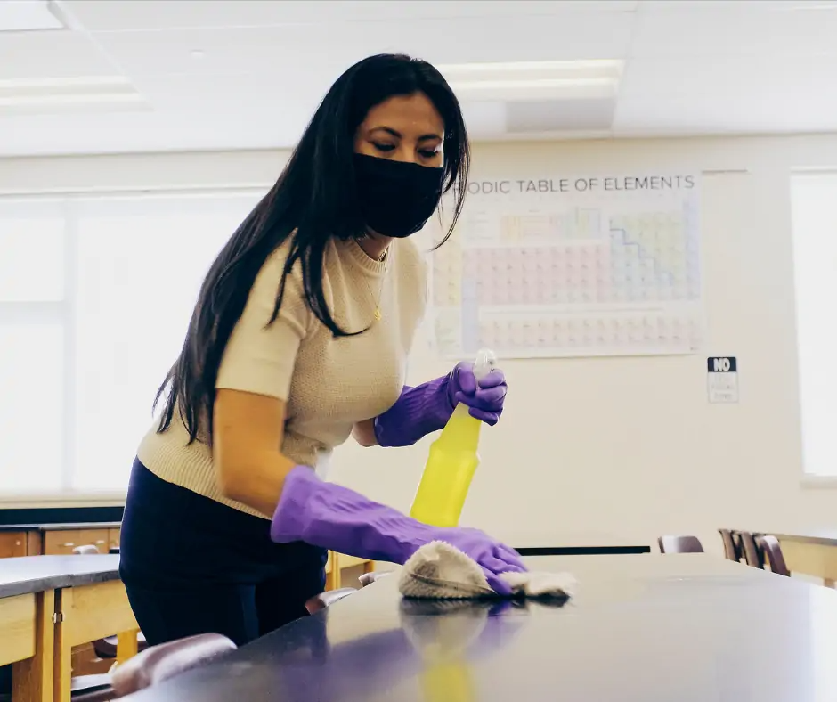 Dezinfectia în școli include sterilizarea suprafețelor cu care elevii vin în contact frecvent, cum ar fi mese, scaune, pupitre, mânerele ușilor, dar și spațiile comune, toalete și cantine. În cazul în care există și internat, dormitoarele și dușurile sunt de asemenea dezinfectate corespunzător.